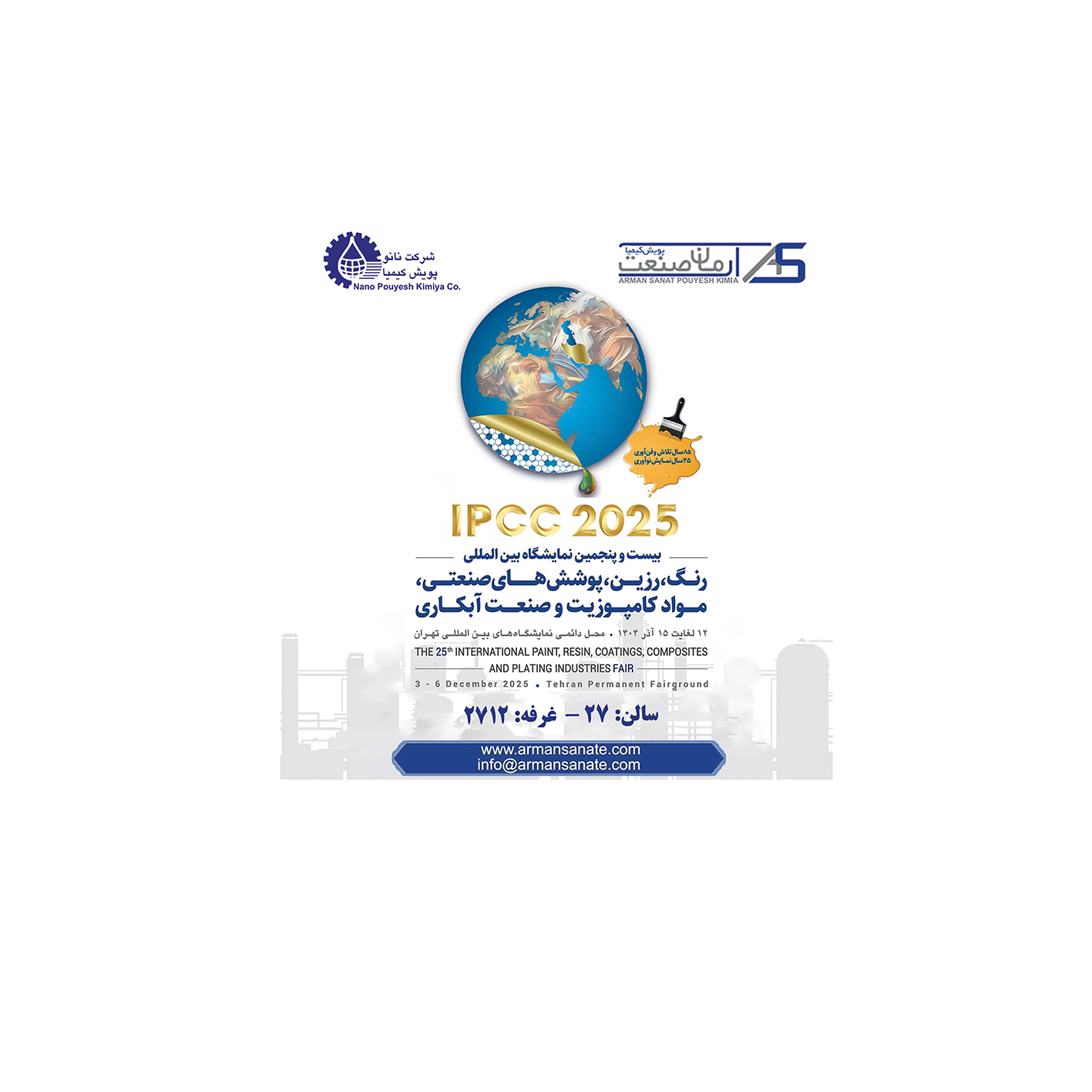 شرکت آرمان صنعت پویش کیمیا، زیر مجموعه شرکت نانو پویش کیمیا، با افتخار در بیست و پنجمین نمایشگاه بین المللی رنگ، رزین، پوشش های صنعتی، مواد کامپوزیت و صنعت آبکاریحضور می یابد و در این رویداد تخصصی، محصولات خود شامل نمک های نیکل و کبالت که به عنوان مواد اولیه در این صنایع کاربرد دارندرا ارائه خواهد کرد.
